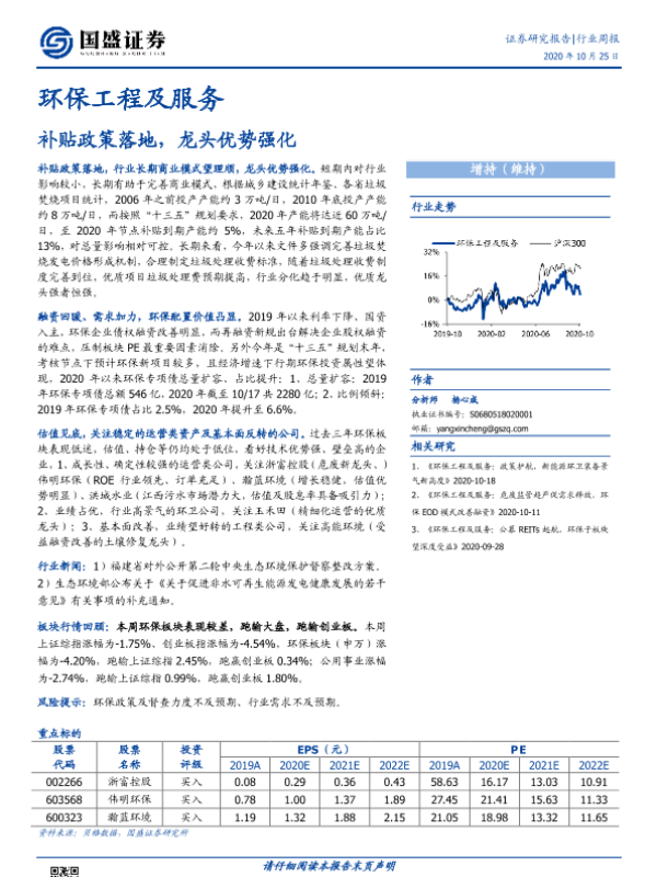 【国盛证券】【20201025】环保工程及服务行业周报:补贴政策落地,龙头优势强化-12页 行业研究
