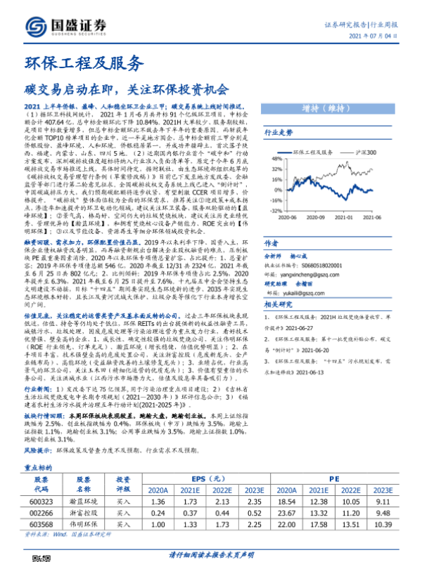 【国盛证券】【20210704】环保工程及服务行业周报:碳交易启动在即,关注环保投资机会-15页 行业研究