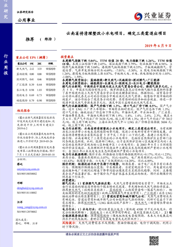 【兴业证券】【20190609】云南省将清理整改小水电项目,确定三类需退出项目-19页 行业研究