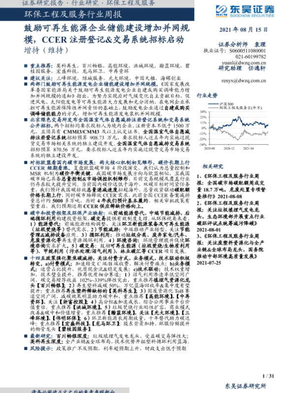 【东吴证券】【20210815】环保工程及服务行业周报:鼓励可再生能源企业储能建设增加并网规模,CCER注册登记&交易系统招标启动-31页 行业研究