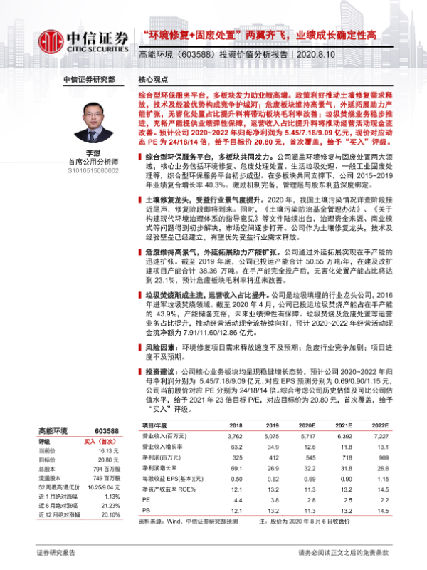 【中信证券】【20200810】20200810-中信证券-高能环境-603588.SH-投资价值分析报告:“环境修复+固废处置”两翼齐飞,业绩成长确定性高-26页 行业研究