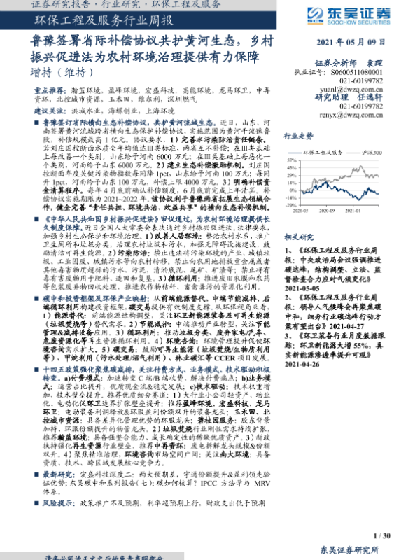 【东吴证券】【20210509】环保工程及服务行业周报:鲁豫签署省际补偿协议共护黄河生态,乡村振兴促进法为农村环境治理提供有力保障-30页 行业研究