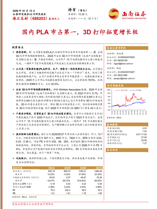 【西南证券】【2024】国内 PLA市占第一,3D打印拓宽增长极-16页 证券期货研究报告