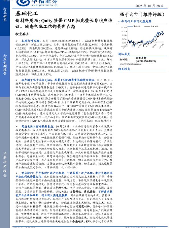 【华福证券】【202510】基础化工:新材料周报:Qnity签署CMP抛光垫长期供应协议,固态电池工信部最新表态-12页 证券期货研究报告