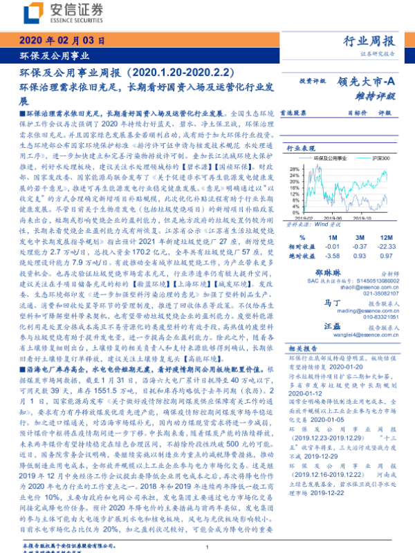 【安信证券】【20200203】环保及公用事业周报:环保治理需求依旧充足,长期看好国资入场及运营化行业发展-22页 行业研究