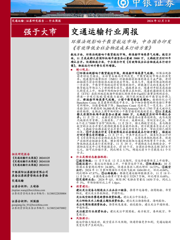 【中银证券】【20241203】交通运输行业周报:环保法规影响干散货航运市场,中办国办印发《有效降低全社会物流成本行动方案》-26页 行业研究