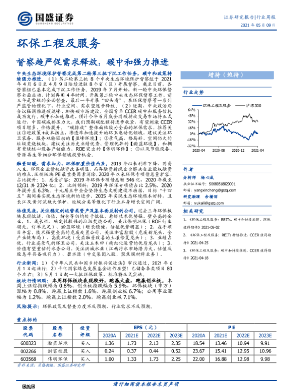 【国盛证券】【20210509】环保工程及服务行业周报:督察趋严促需求释放,碳中和强力推进-12页 行业研究