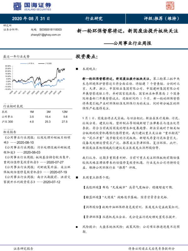 【国海证券】【20200831】公用事业行业周报:新一轮环保督察将近,新固废法提升板块关注-10页 行业研究