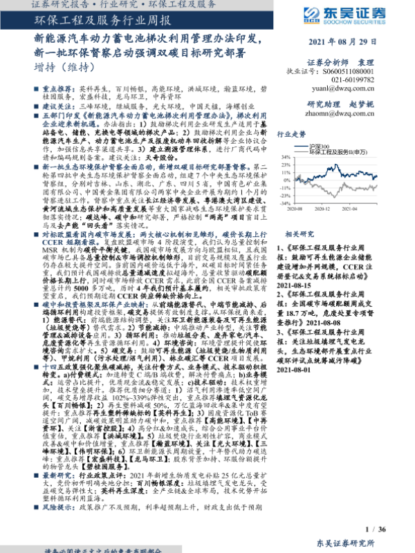 【东吴证券】【20210829】环保工程及服务行业周报:新能源汽车动力蓄电池梯次利用管理办法印发,新一批环保督察启动强调双碳目标研究部署-36页 行业研究