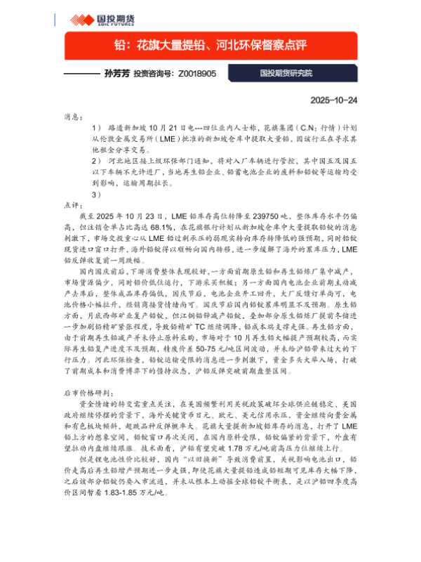 【国投期货研究院】【202510】铅_花旗大量提铅_河北环保督察点评-2页 证券期货研究报告