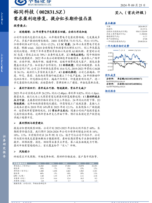 【华福证券】【20240925】裕同科技(002831)需求盈利迎修复,提分红长期价值凸显-21页 行业研究