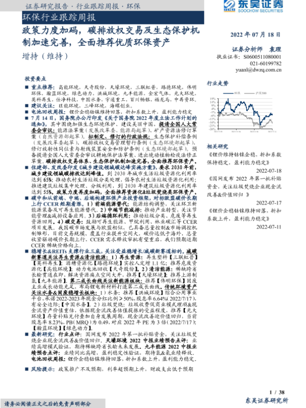 【东吴证券】【20220718】环保行业跟踪周报:政策力度加码,碳排放权交易及生态保护机制加速完善-38页 行业研究