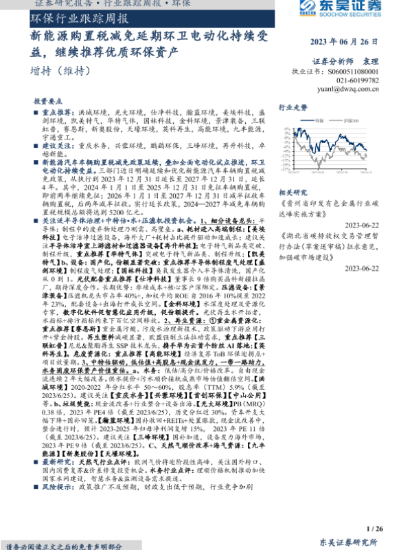 【东吴证券】【20230626】环保行业跟踪周报:新能源购置税减免延期环卫电动化持续受益,继续推荐优质环保资产-26页 行业研究