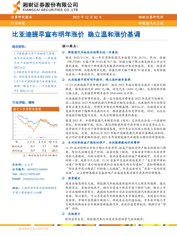 【湘财证券】【20221202】比亚迪提早宣布明年涨价 确立温和涨价基调-14页 行业研究