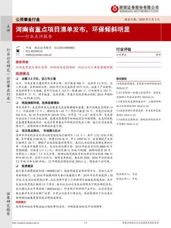 【浙商证券】【20200303】河南省重点项目清单发布,环保倾斜明显-2页 行业研究