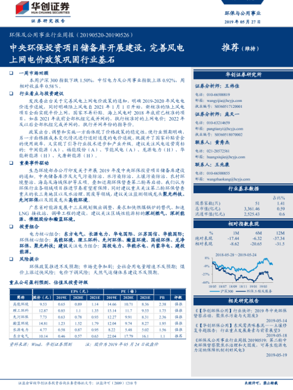 【华创证券】【20190527】环保与公用事业行业周报:中央环保投资项目储备库开展建设,完善风电上网电价政策巩固行业基石-30页 行业研究