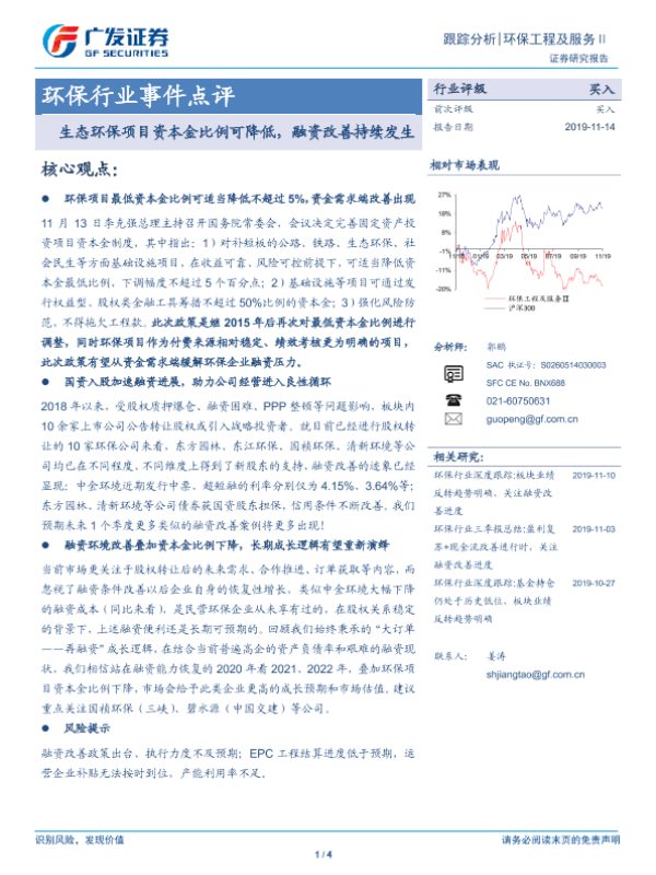 【广发证券】【20191114】环保行业事件点评:生态环保项目资本金比例可降低,融资改善持续发生-4页 行业研究