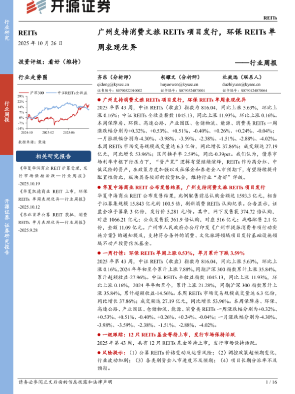 【开源证券】【202510】广州支持消费文旅REITs项目发行,环保REITs单周表现优异-16页 证券期货研究报告