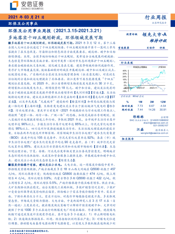 【安信证券】【20210321】环保及公用事业周报:多地落实十四五规划新政,环保领域发展可期-18页 行业研究