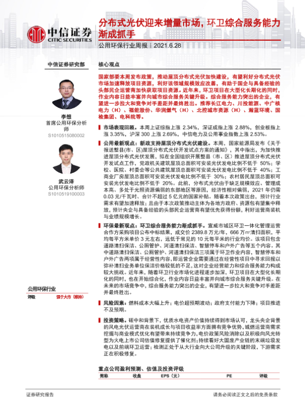 【中信证券】【20210628】公用环保行业周报:分布式光伏迎来增量市场,环卫综合服务能力渐成抓手-9页 行业研究