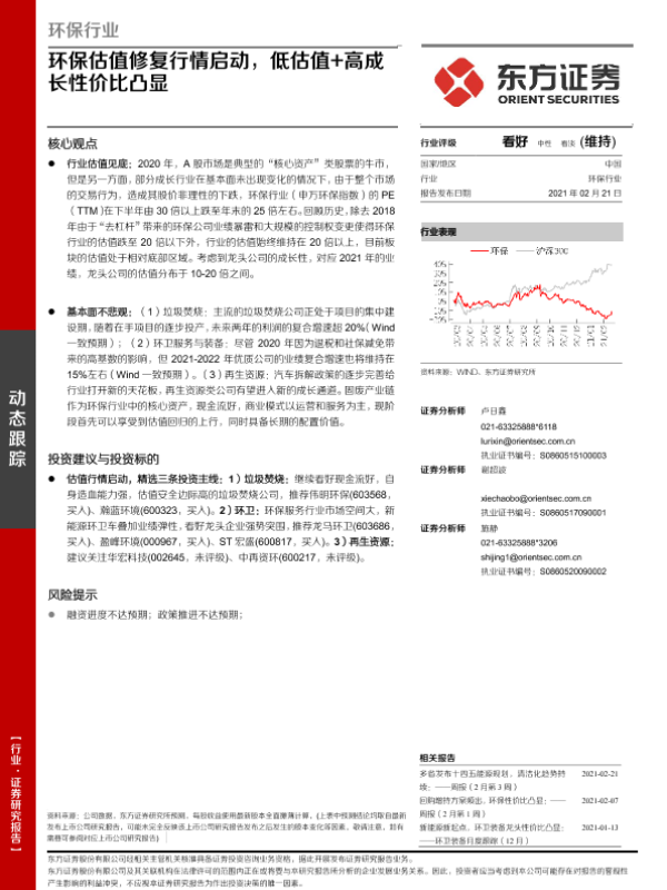 【东方证券】【20210221】环保行业动态跟踪:环保估值修复行情启动,低估值+高成长性价比凸显-4页 行业研究