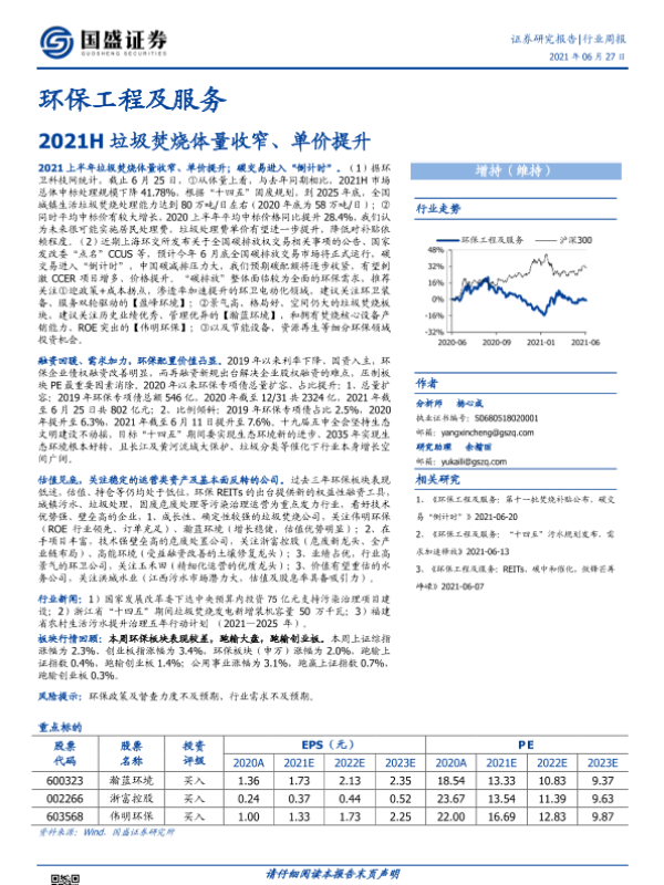 【国盛证券】【20210627】环保工程及服务行业周报:2021H垃圾焚烧体量收窄、单价提升-15页 行业研究