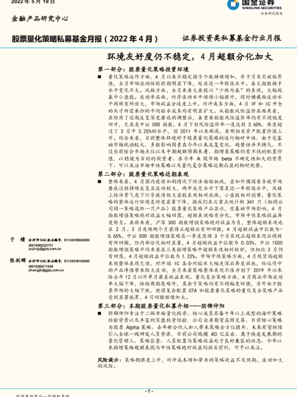 【国金证券】【20220519】证券投资类私募基金行业月报:环境友好度仍不稳定,4月超额分化加大-16页 行业研究