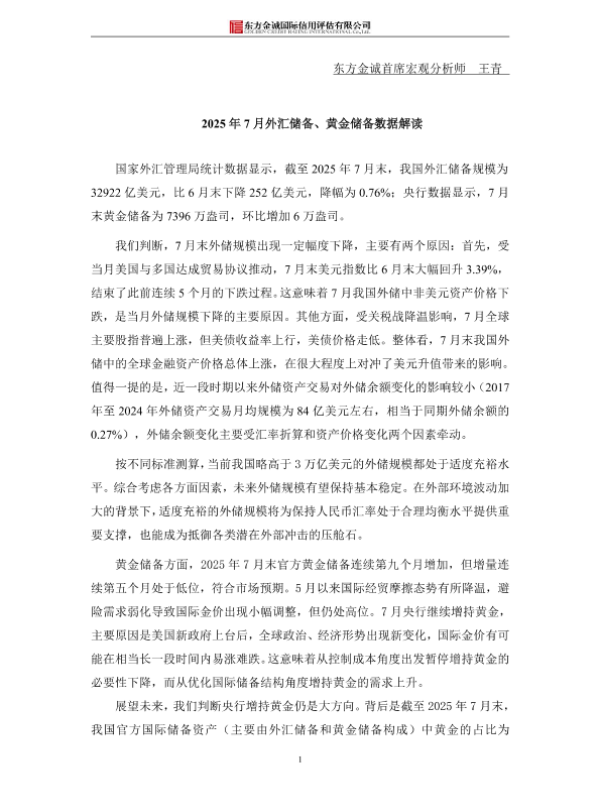 【东方金诚】【20250807】2025年7月外汇储备、黄金储备数据解读-2页 宏观策略