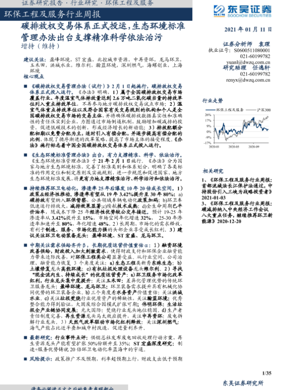【东吴证券】【20210111】环保工程及服务行业周报:碳排放权交易体系正式投运,生态环境标准管理办法出台支撑精准科学依法治污-35页 行业研究