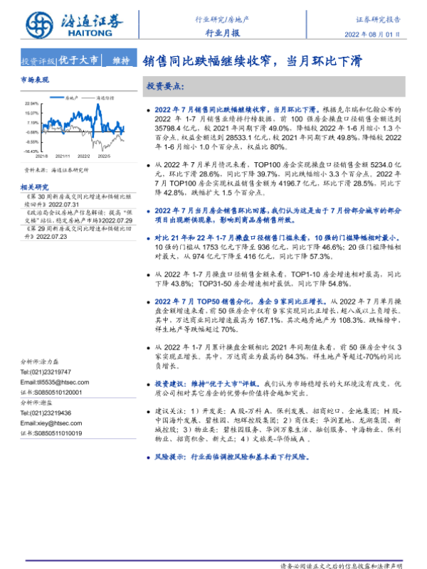 【海通证券】【20220801】房地产行业月报:销售同比跌幅继续收窄,当月环比下滑-10页 行业研究