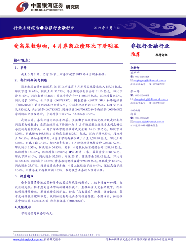 【银河证券】【20190509】受高基数影响,4月券商业绩环比下滑明显-3页 行业研究