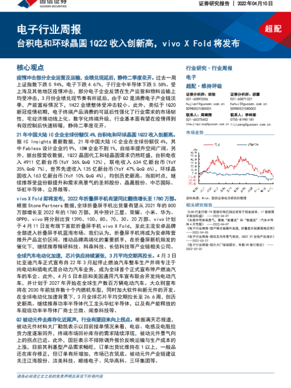 【国信证券】【20220410】电子行业周报:台积电和环球晶圆1Q22收入创新高,vivo X Fold将发布-13页 行业研究