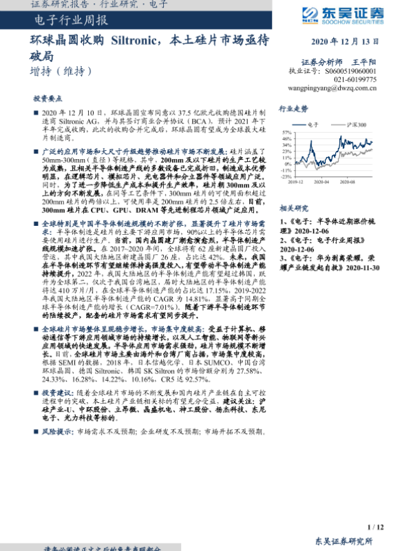 【东吴证券】【20201213】电子行业周报:环球晶圆收购Siltronic,本土硅片市场亟待破局-12页 行业研究
