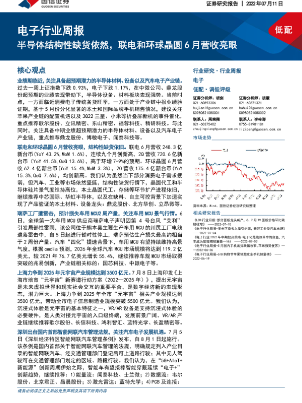 【国信证券】【20220711】电子行业周报:半导体结构性缺货依然,联电和环球晶圆6月营收亮眼-13页 行业研究