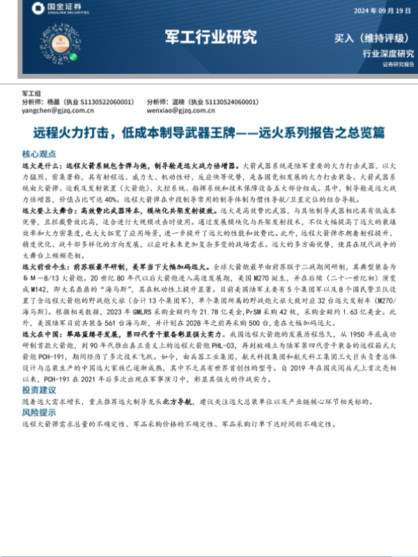 【国金证券】【20240919】军工行业远火系列报告之总览篇:远程火力打击,低成本制导武器王牌-26页 行业研究