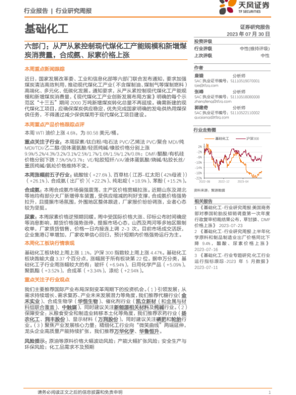 【天风证券】【20230730】20230730-天风证券-基础化工行业研究周报:六部门:从严从紧控制现代煤化工产能规模和新增煤炭消费量,合成氨、尿素价格上涨-19页 行业研究