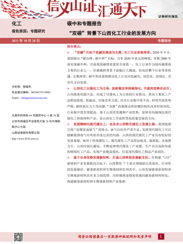 【山西证券】【20211020】“双碳”背景下山西化工行业的发展方向-29页 行业研究