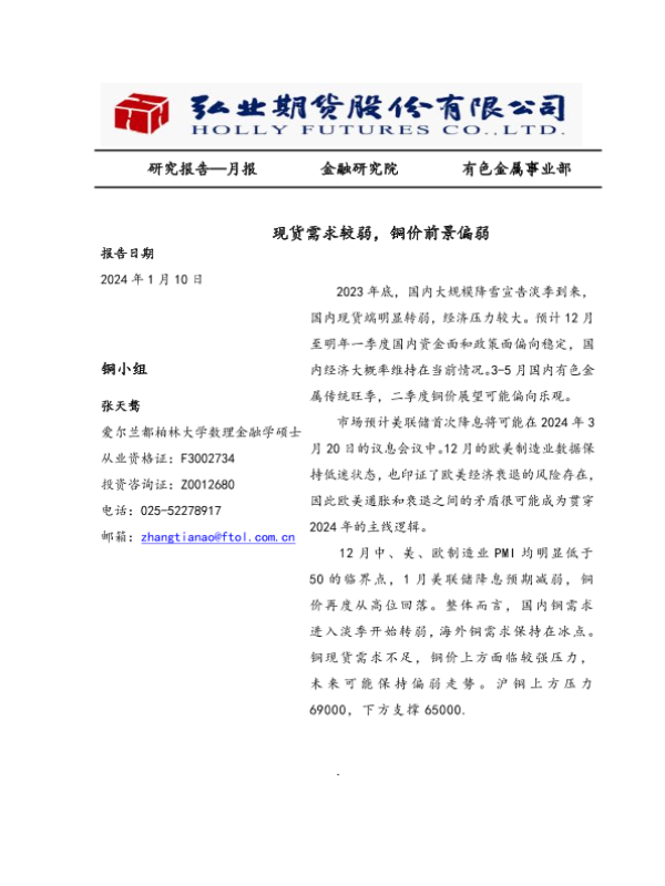 【弘业期货】【20240110】铜月报:现货需求较弱,铜价前景偏弱-10页 行业研究