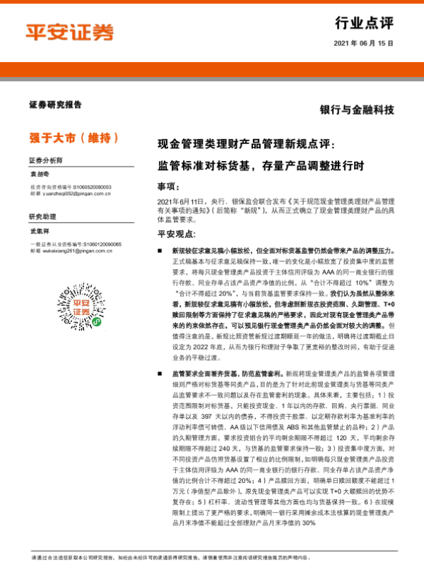 【平安证券】【20210615】现金管理类理财产品管理新规点评:监管标准对标货基,存量产品调整进行时-5页 行业研究