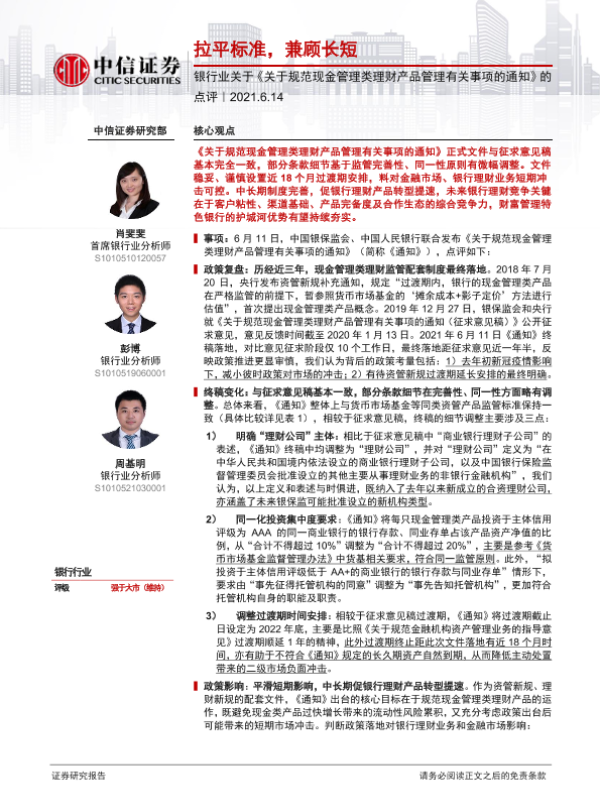 【中信证券】【20210614】银行业关于《关于规范现金管理类理财产品管理有关事项的通知》的点评-5页 行业研究