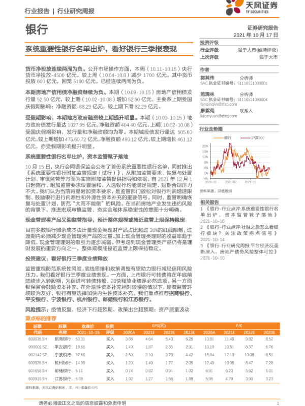 【天风证券】【20211017】系统重要性银行名单出炉,看好银行三季报表现-18页 行业研究