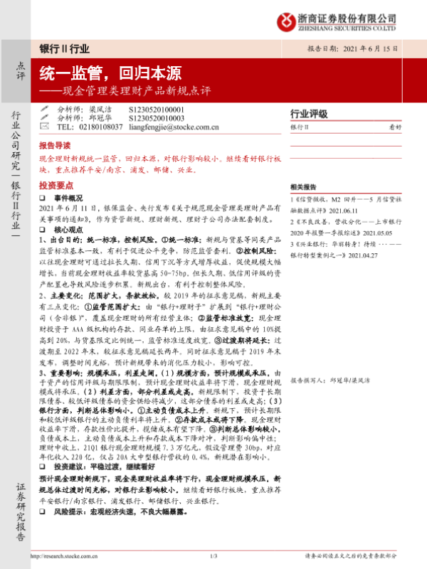 【浙商证券】【20210615】现金管理类理财产品新规点评:统一监管,回归本源-3页 行业研究