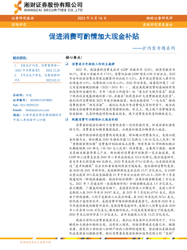 【湘财证券】【20230316】扩内需专题系列:促进消费可酌情加大现金补贴-21页 行业研究