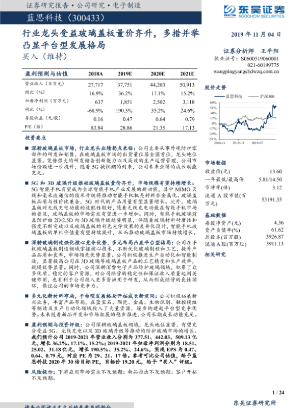 【东吴证券】【20191104】行业龙头受益玻璃盖板量价齐升,多措并举凸显平台型发展格局-24页 行业研究