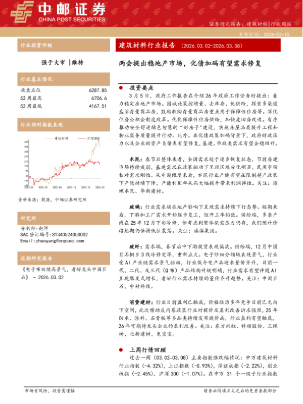 【中邮证券】【202603】建筑材料|行业周报:节后需求平稳复苏,期待政策加码-7页 证券期货研究报告