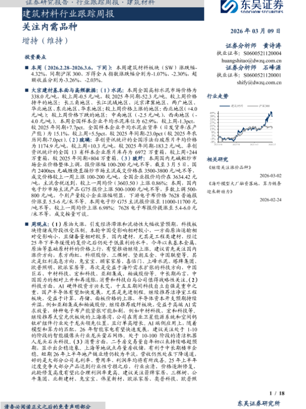 【东吴证券】【202603】建筑材料行业跟踪周报:关注内需品种-18页 证券期货研究报告