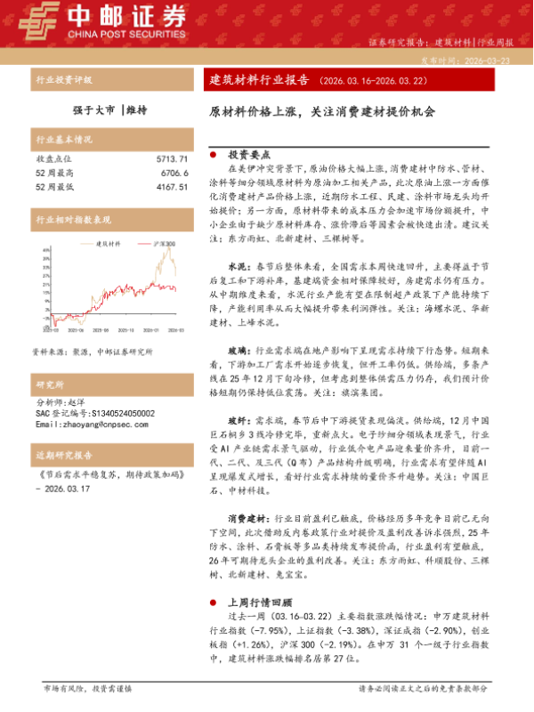 【中邮证券】【202603】建筑材料行业周报:原材料价格上涨,关注消费建材提价机会-7页 证券期货研究报告