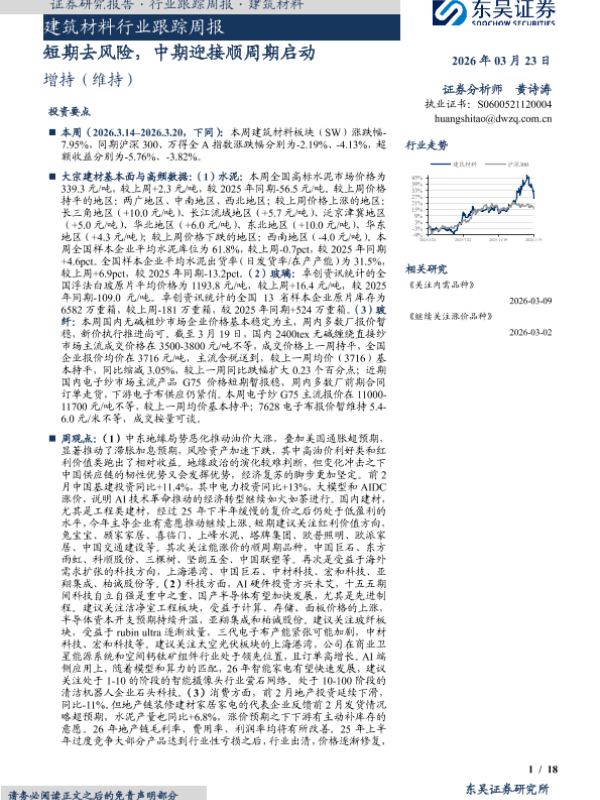 【东吴证券】【202603】建筑材料行业跟踪周报·短期去风险,中期迎接顺周期启动-18页 证券期货研究报告