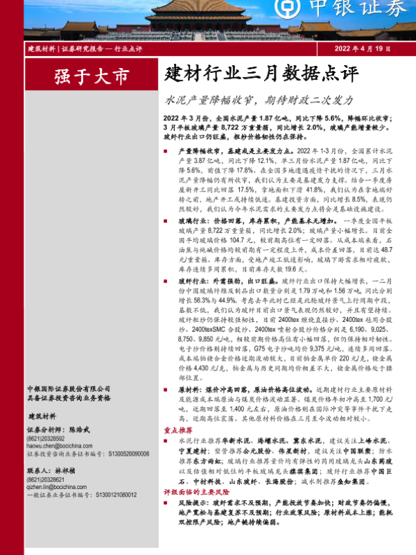 【中银证券】【20220419】建材行业三月数据点评:水泥产量降幅收窄,期待财政二次发力-11页 行业研究