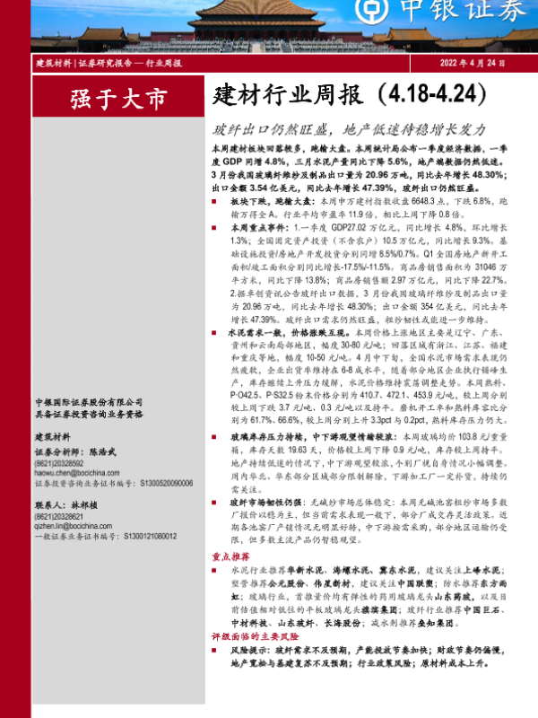 【中银证券】【20220424】建材行业周报:玻纤出口仍然旺盛,地产低迷待稳增长发力-18页 行业研究